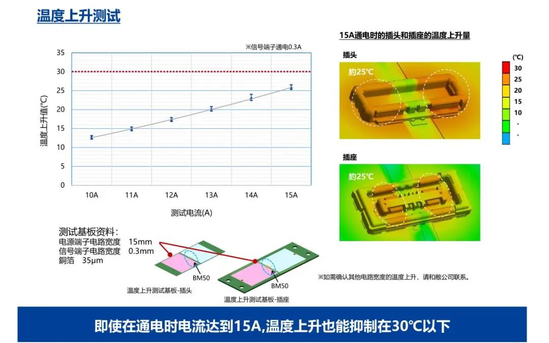 特点 1 兼顾供电能力和小型化的设计 - 额定电流:支持电源端子15A、信号端子0.3A - 嵌合高度:0.6mm、纵深:2.0mm 2 通过全包覆构造,确保高牢固性 3 使接触电阻最小化,节省电力 4 实现小型,高抜出力 5 互相夹紧型多触点构造,确保高接触可靠性 有助于小型化&大电流化