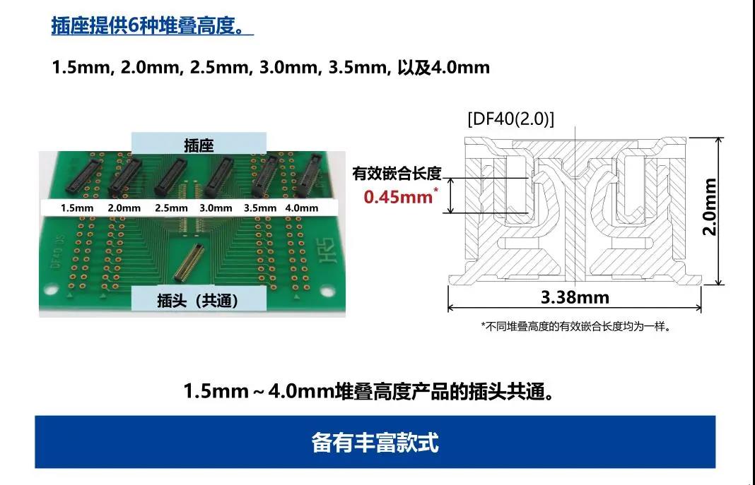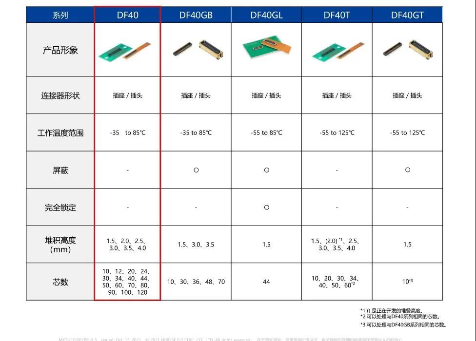 特点 1. 省空间:纵深3.38mm 2. 堆叠高度 1.5-4.0mm 3. 对应USB4 Gen.2(10Gbps)信号传输 *1 4. 有效嵌合长度长:0.45mm 5. 卓越的端子构造实现了明确的锁扣手感以及大嵌合力 6. 防止端子变形构造 7. 种类繁多(带护罩:DF40G系列,带完全锁:DF40GL系列,ADAS:DF40T系列) 8.核心数量从10到120核心变化巨大 9.用导向肋确保自动对准:0.33mm 10.防止镍阻挡层焊接的结构 11.还提供用于生产线检查的高度耐用的连接器* 只有H=1.5 mm的产品支持Type-C DF40系列变体